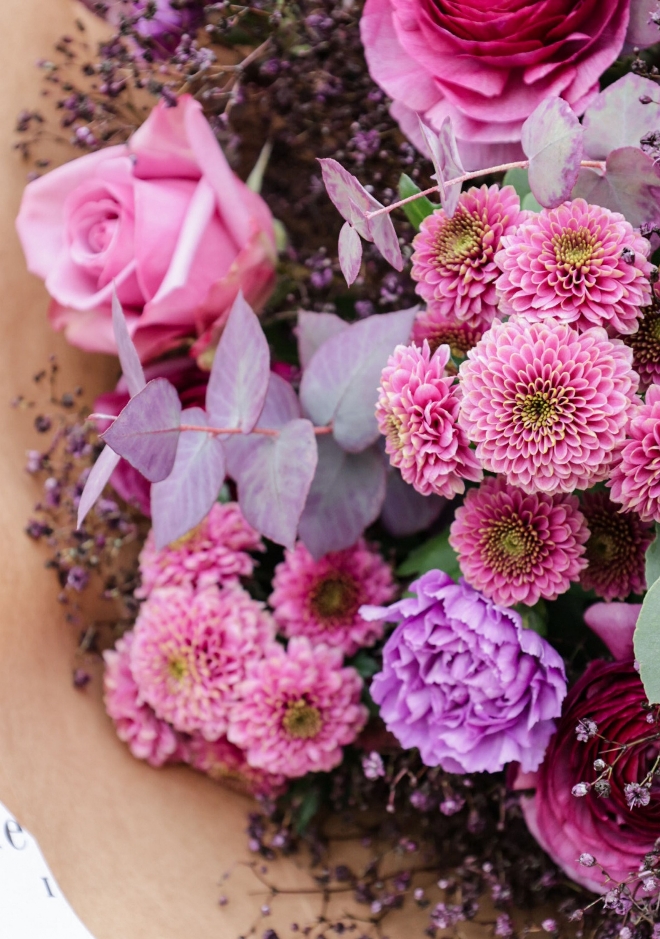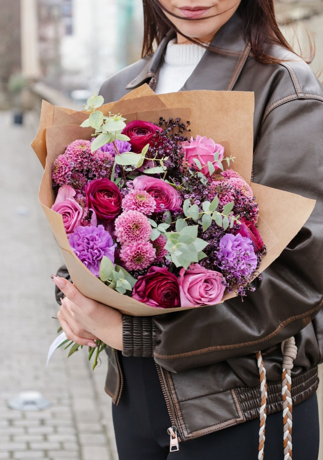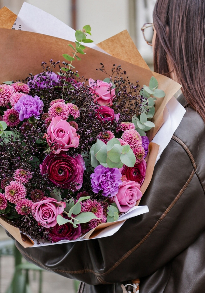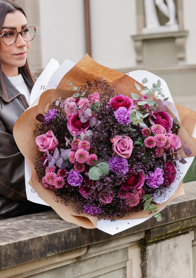 Découvrez notre bouquet Puplinge, une création exclusive imaginée pour illuminer le mois de janvier. Ses tonalités violettes, profondes et raffinées, apportent une touche de chaleur et de couleur à votre intérieur, tandis que l’extérieur se fait plus frais et hivernal. Composé avec soin, ce bouquet marie la délicatesse des renoncules violettes, l’élégance des roses Deep Purple, la texture singulière des œillets Moonlite violets, la légèreté d’une gypsophile teintée aubergine, ainsi que la rondeur des chrysanthèmes Doria. Un assemblage harmonieux et moderne, parfait pour offrir ou pour égayer votre propre espace durant la saison froide.